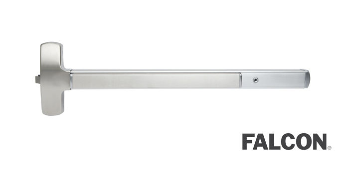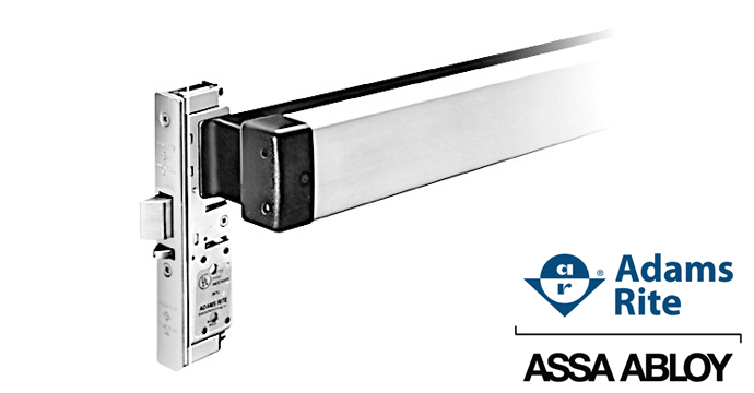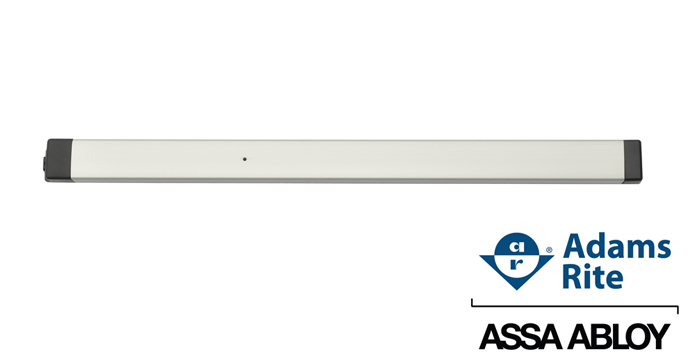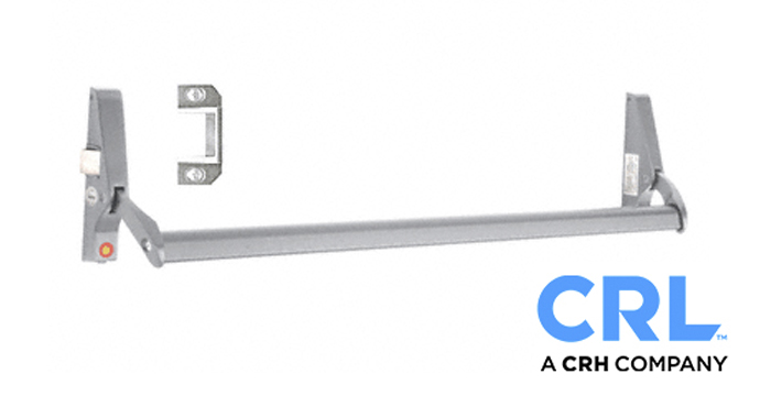 Designed for narrow stile aluminum and glass doors, this exit device has a sleek appearance and a secure rotating latch mechanism. They are stocked in two finishes and in widths to fit 36” and 42” single doors.